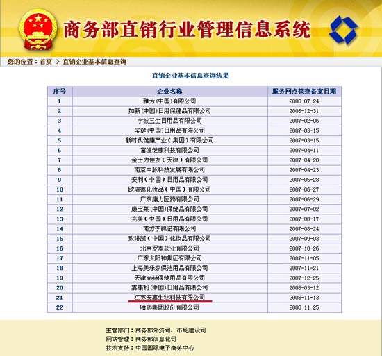 2008年11月13日,從商務部直銷行業管理信息系統傳出信息:江蘇安惠生物科技有限公司獲得中華人民共和國直銷經營許可,并已完成服務網點核查備案。安惠公司將依法在獲得批準的直銷區域開展直銷經營活動。