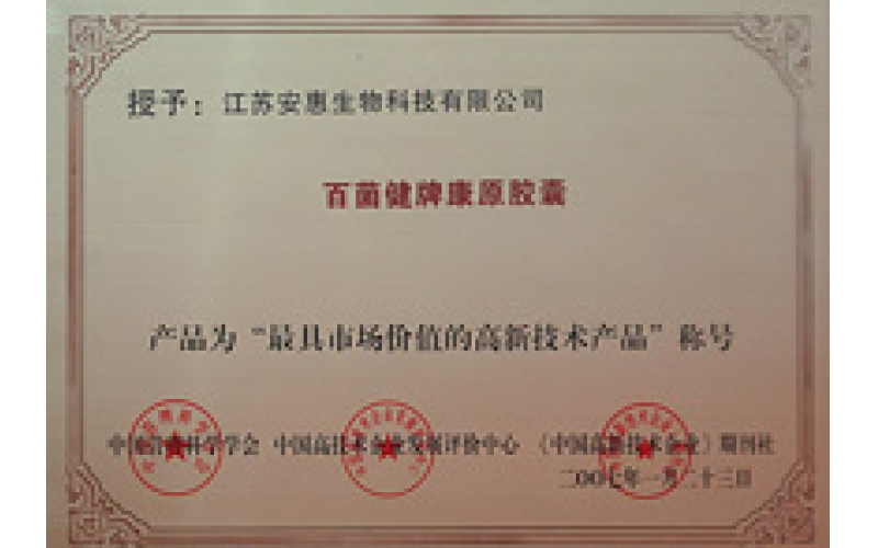 2007年1月24日,安惠百菌健牌康原膠囊產(chǎn)品獲得中國管理科學學會、中國高技術(shù)企業(yè)發(fā)展評價中心、中國高新技術(shù)企業(yè)期刊社聯(lián)合評定的“最具市場價值的高新技術(shù)產(chǎn)品”榮譽稱號。同時,百菌健牌康原膠囊還與公司的另一產(chǎn)品——靈芝孢子蟲草菌絲體粉攜手獲得“江蘇省名牌產(chǎn)品”榮譽稱號。