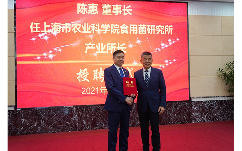 2021年3月22日,上海市農(nóng)業(yè)科學院食用菌研究所與江蘇安惠生物科技有限公司共同成立“聯(lián)合科技創(chuàng)新中心”舉行揭牌儀式。會上,安惠公司董事長陳惠受聘該院食用菌研究所產(chǎn)業(yè)所長。
