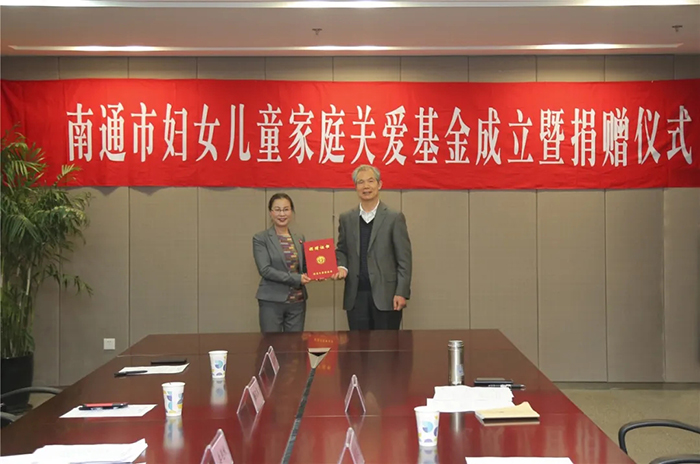 2020年4月20日,南通市婦女兒童家庭關(guān)愛基金成立。南通市女企業(yè)家協(xié)會副會長、安惠公司副董事長陸漢萍為基金注入第一筆愛心善款10萬元。
